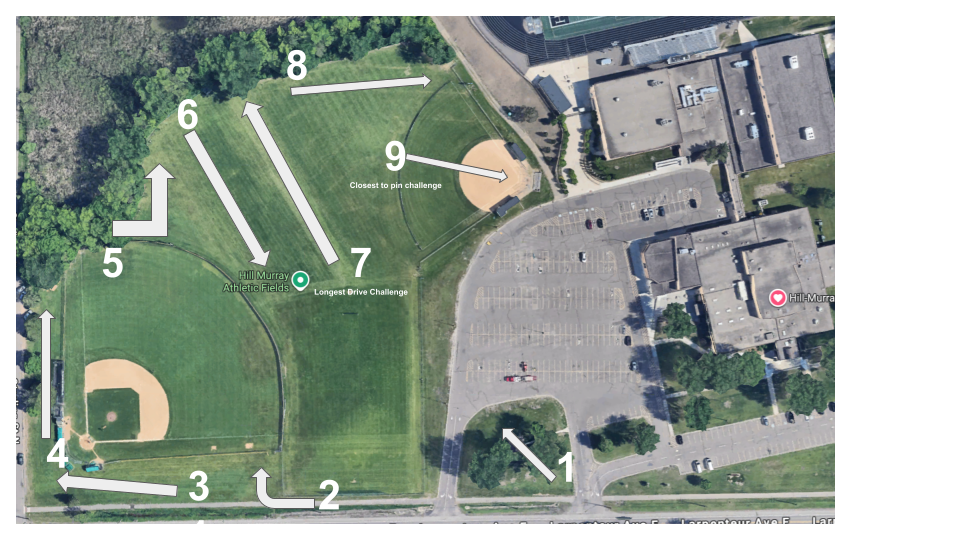 Everyone is welcome to participate. Each team member can golf up to TWO rounds. Only the best score from each team will be ranked to earn points for your team, so you cannot possibly hurt your team by participating. Start your round any time between 3:10 and 4:15. You must play with at least one member from a different team, and score cards must be signed at the end of your round. Course layout is below.